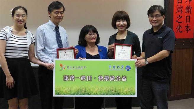 中原大學副校長李英明(左二)代表校友認養30畝田做公益,二林喜樂保育院長林玉嫦(中)代表接下愛心。(鐘武達攝)