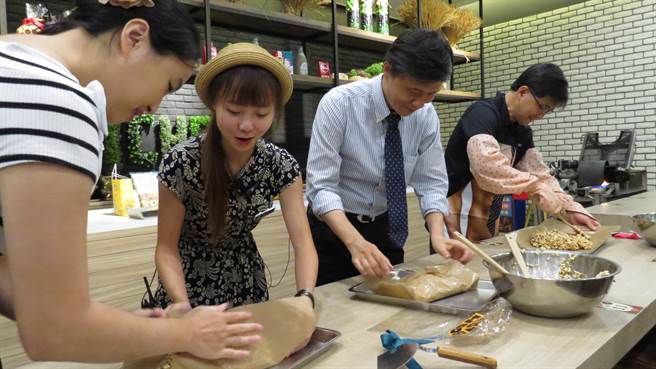 中原大學副校長李英明等人認養愛心農田,也體驗傳統爆米香。(鐘武達攝)