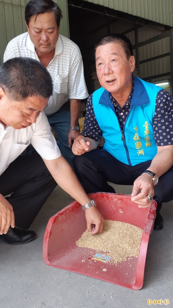 張國洲今天到台東地區農會位於建農里的碾米廠,由總幹事李建通陪同勘查進廠災穀及烘乾作業,雙方用畚箕盛起稻殼,很清楚可以看到「毛毛的」,都是發芽穀。
